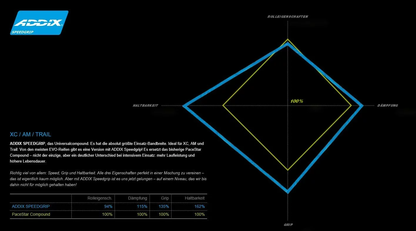 ADDIX SPEEDGRIP, das Universalcompound. Es hat die absolut größte Einsatz-Bandbreite. Ideal für XC, AM und Trail: Von den meisten EVO-Reifen gibt es eine Version mit ADDIX Speedgrip! Es ersetzt das bisherige PaceStar Compound – nicht der einzige, aber ein deutlicher Unterschied bei intensivem Einsatz: mehr Laufleistung und höhere Lebensdauer. Richtig viel von allem: Speed, Grip und Haltbarkeit. Alle drei Eigenschaften perfekt in einer Mischung zu vereinen – das ist eigentlich kaum möglich. Aber mit ADDIX Speedgrip ist es uns jetzt gelungen – auf einem Niveau, das wir bis dahin nicht für möglich gehalten haben !
